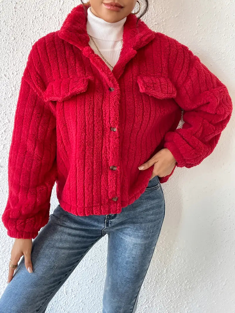 Czerwona kurtka polarowa o prążkowanej fakturze z kieszeniami