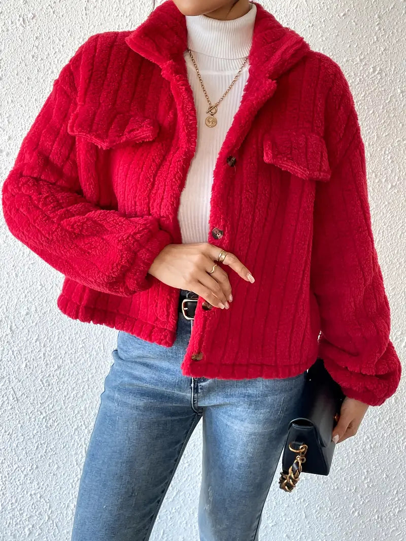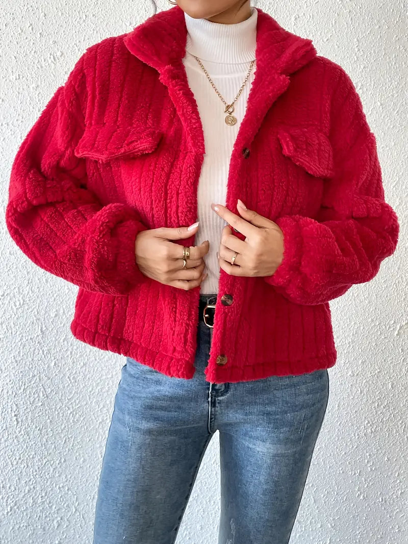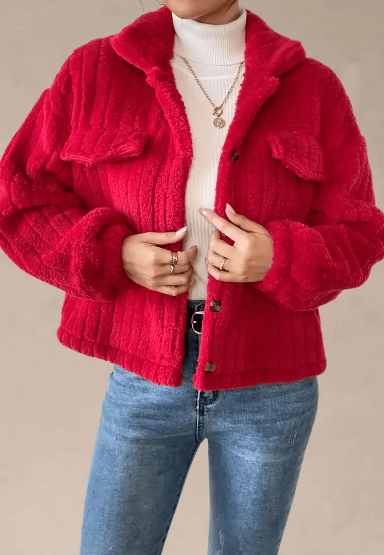 Dodaj swojej zimowej garderobie odrobinę energii dzięki tej ciepłej, czerwonej kurtce polarowej o prążkowanej fakturze. Wykonana z miękkiego, przyjemnego w dotyku materiału, zapewnia komfort noszenia nawet w chłodniejsze dni. Luźny krój i klasyczny kołnierz nadają jej swobodny, casualowy charakter, a zapinanie na guziki umożliwia wygodne dopasowanie. Praktyczne kieszenie z patkami dodają funkcjonalności i uroku.