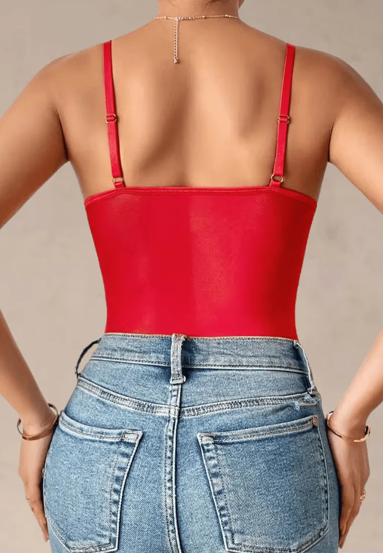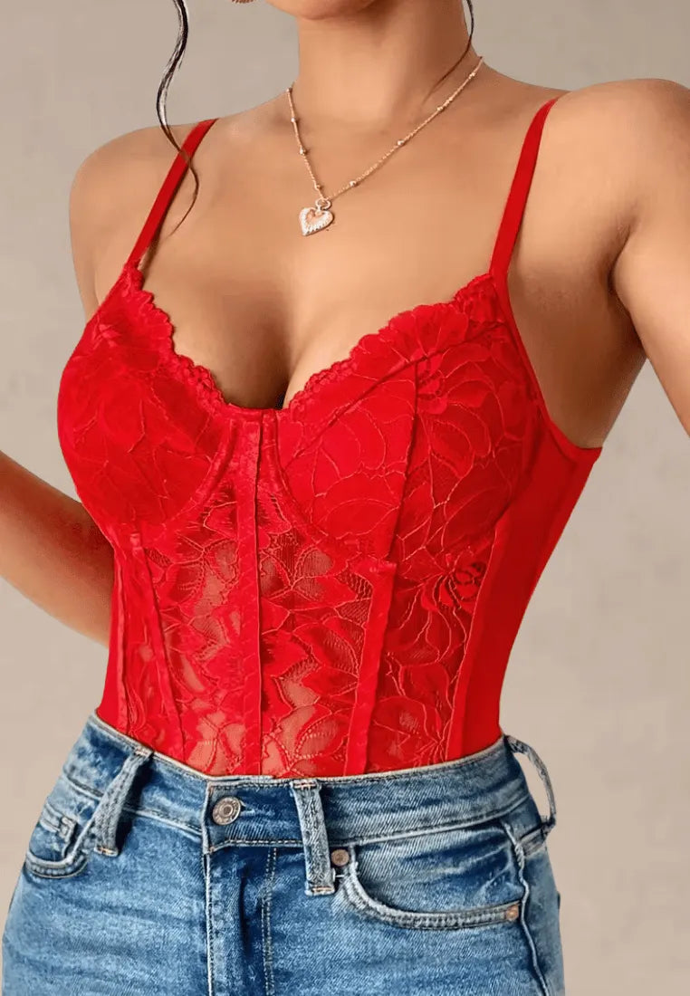 Czerwone body damskie koronkowe gorsetowe na ramiączkach z modelującym fasonem to niezwykle zmysłowa propozycja dla kobiet, które chcą podkreślić swoją kobiecość i przyciągać spojrzenia. Intensywna czerwień w połączeniu z delikatną koronką tworzy wyjątkowo seksowny i elegancki efekt.