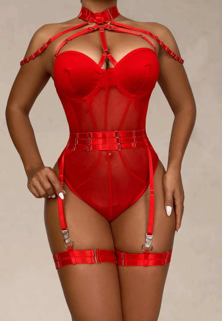 Czerwony zestaw bielizny damski o mocnym, wyrazistym charakterze, stworzony dla kobiet ceniących odważny styl i nowoczesne detale. Gorsetowy biustonosz z usztywnionymi miseczkami pięknie modeluje i podkreśla biust, a transparentne panele z siateczki subtelnie eksponują sylwetkę. Dekoracyjne paski typu harness oplatają dekolt, ramiona i talię, tworząc efektowną, geometryczną kompozycję. Szeroki pas w talii wysmukla figurę, a regulowane paski na uda dodają całości drapieżnego, zmysłowego charakteru. To idealny zestaw na wyjątkowe okazje, kiedy chcesz poczuć się pewnie, seksownie i bezkompromisowo kobieco.