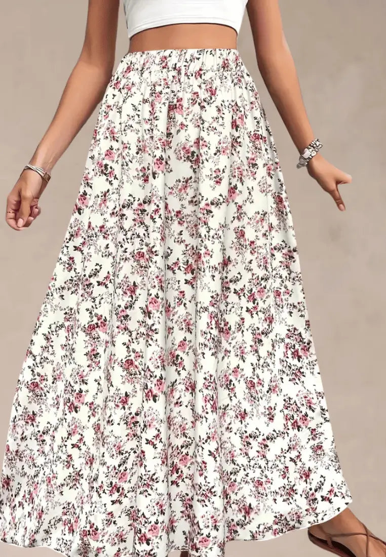 Podkreśl swój romantyczny styl i kobiecą delikatność z długą białą spódnicą w drobne różowe kwiaty. Ten lekki, zwiewny model to idealny wybór dla kobiet, które cenią wygodę połączoną z subtelną elegancją. Wykonana z przewiewnego materiału, pięknie układa się na sylwetce, a elastyczny pas gwarantuje komfort noszenia i idealne dopasowanie. Rozkloszowany krój nadaje stylizacji lekkości i swobody, doskonale sprawdzając się w ciepłe, słoneczne dni.