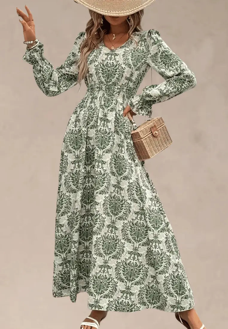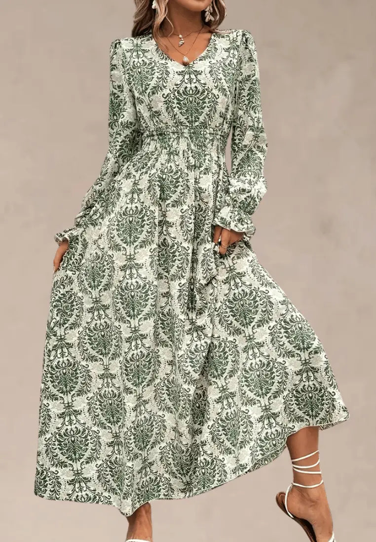 Odkryj wyjątkową elegancję z długą białą sukienką w zielony, ornamentalny wzór, stworzoną z myślą o kobietach ceniących styl i wygodę. Model o swobodnym, rozkloszowanym kroju subtelnie podkreśla talię dzięki elastycznemu ściągaczowi, jednocześnie zapewniając komfort noszenia przez cały dzień. Długie rękawy z delikatnymi marszczeniami przy mankietach dodają całości romantycznego charakteru, a lekki, przewiewny materiał sprawia, że sukienka idealnie sprawdzi się w cieplejsze dni.