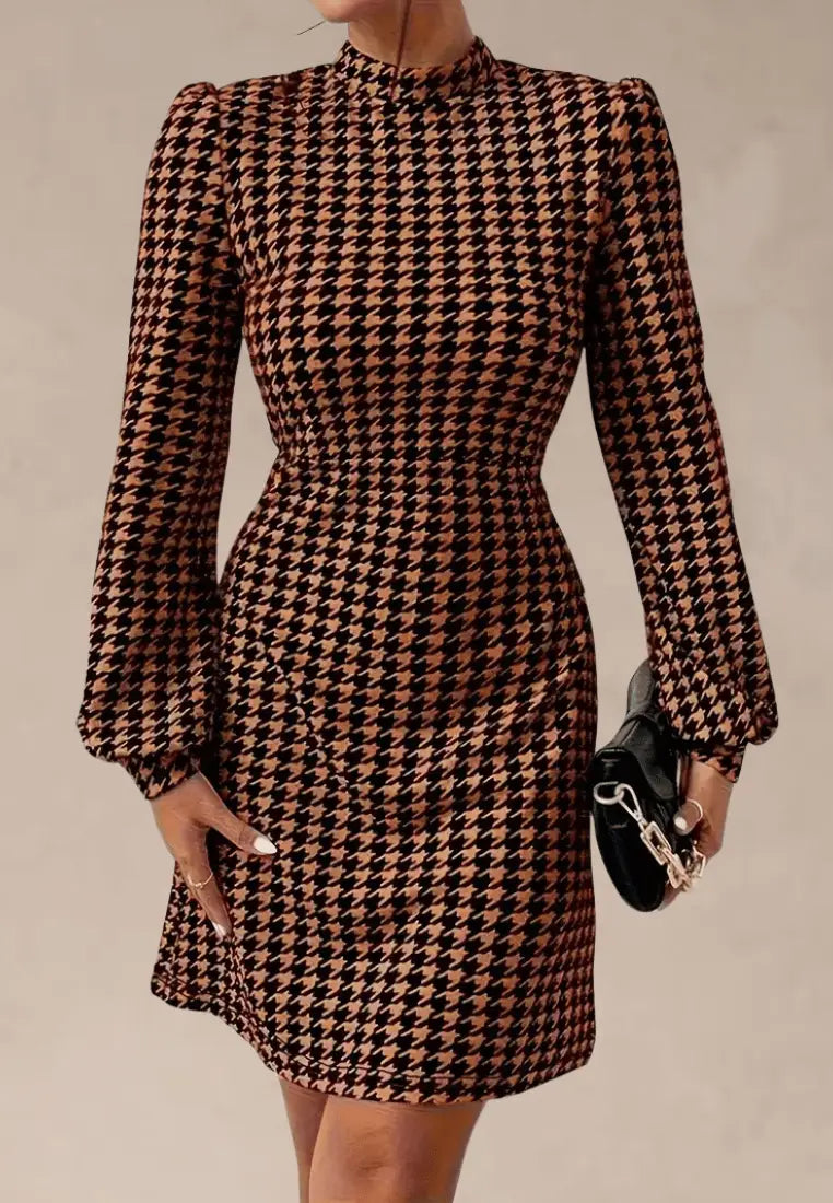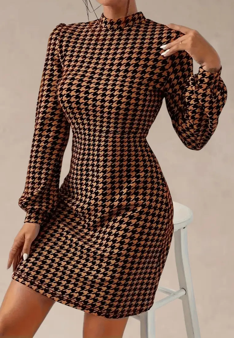 Podkreśl swoją sylwetkę i dodaj elegancji swoim stylizacjom z dopasowaną sukienką mini w klasyczny wzór pepitki. Ten ponadczasowy print w brązowo-czarnym odcieniu sprawia, że sukienka wyróżnia się wyrafinowanym charakterem, a jednocześnie jest niezwykle uniwersalna.