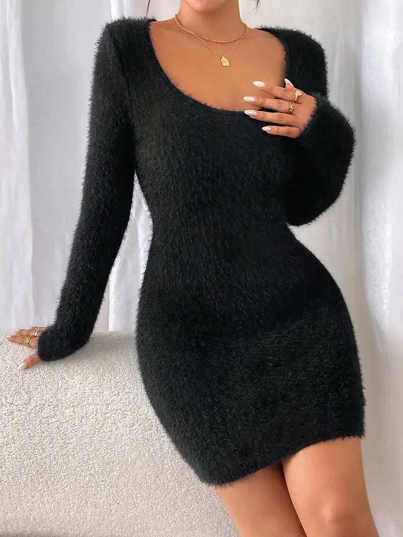 Odkryj wyjątkową kombinację komfortu i zmysłowego stylu z czarną dopasowaną sukienką swetrową wykonaną z miękkiej, puszystej dzianiny. Ten model otula sylwetkę, subtelnie podkreślając kobiece kształty, a jednocześnie zapewnia niezwykłą wygodę noszenia. Dekolt w serek dodaje sukience lekkości i kobiecego uroku, idealnie eksponując szyję i obojczyki.