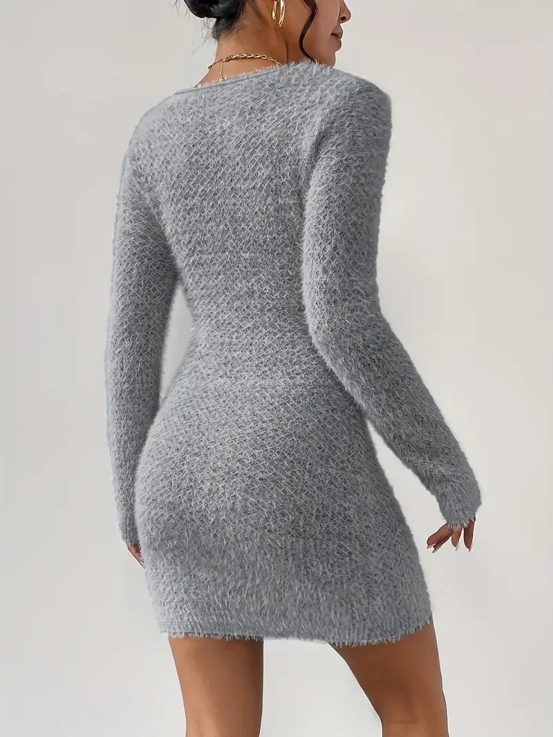 Długie, dopasowane rękawy oraz elastyczny materiał sprawiają, że sukienka doskonale dopasowuje się do ciała, jednocześnie pozwalając na swobodę ruchów. Ciepła i przyjemna w dotyku tkanina sprawia, że jest to świetny wybór na chłodniejsze dni.