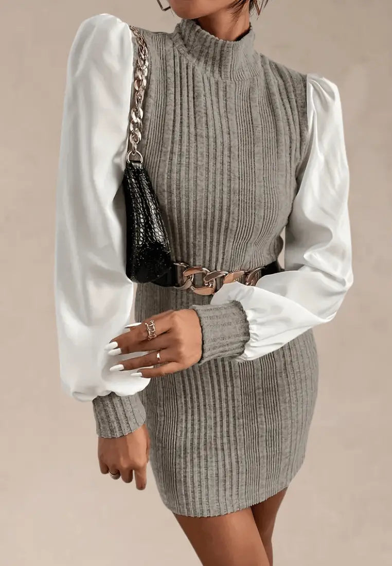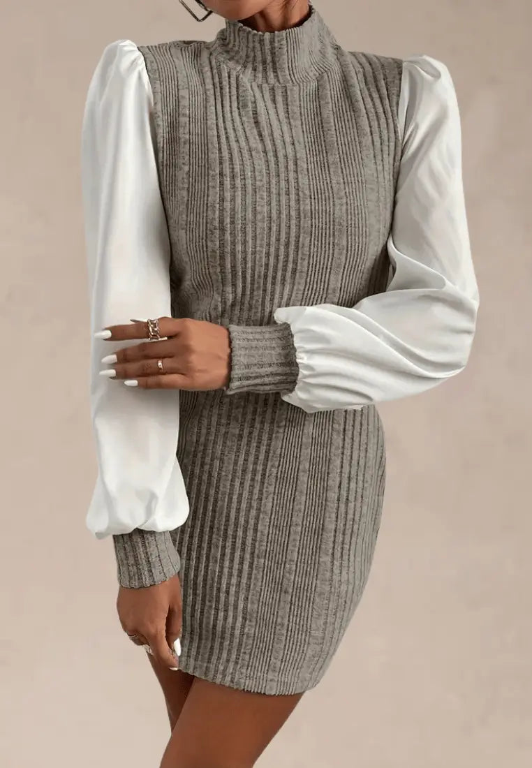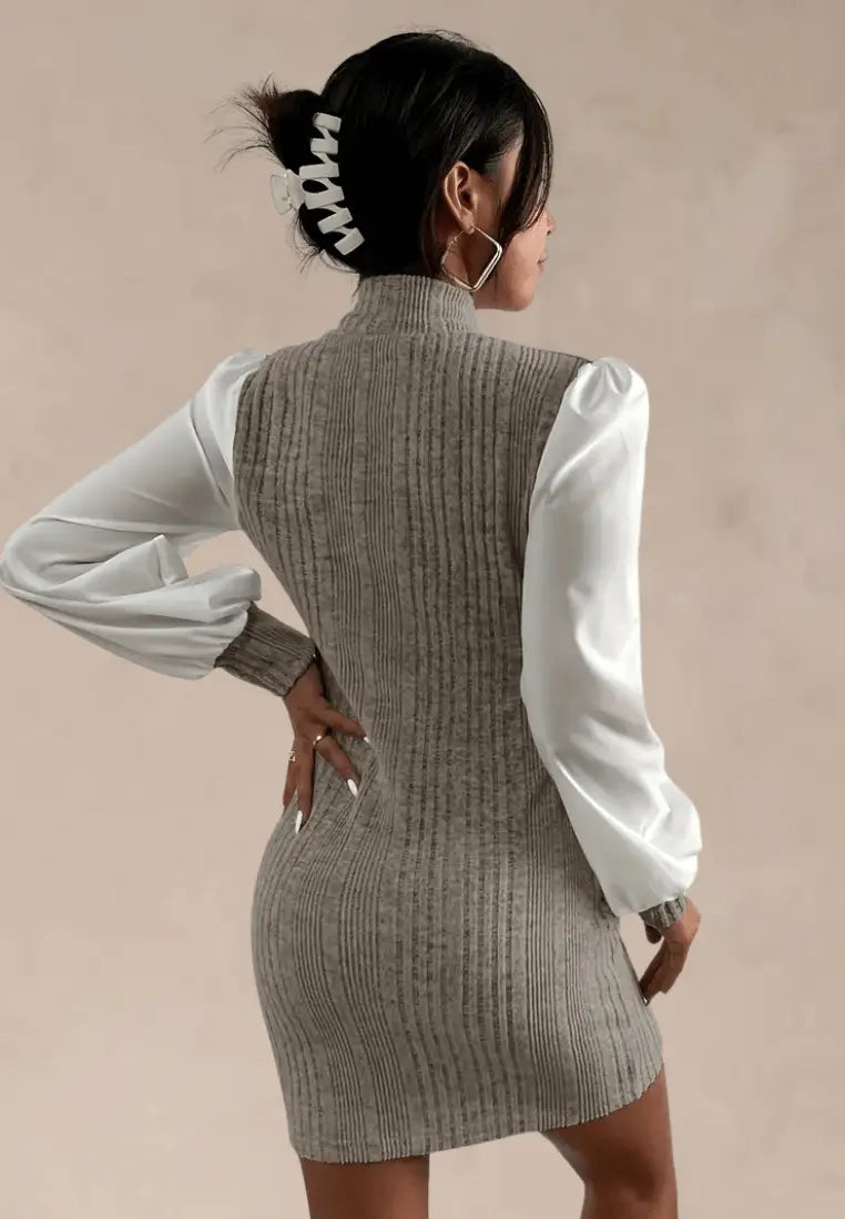 Odkryj połączenie klasyki z nutą nowoczesności w dzianinowej sukience mini z bufiastymi rękawami i stójką w odcieniach beżu. To wyjątkowy model, który zachwyca kontrastowym zestawieniem dzianinowego, prążkowanego materiału z miękkimi, delikatnymi rękawami w kolorze ecru. Sukienka idealnie dopasowuje się do sylwetki, subtelnie podkreślając kobiece kształty.