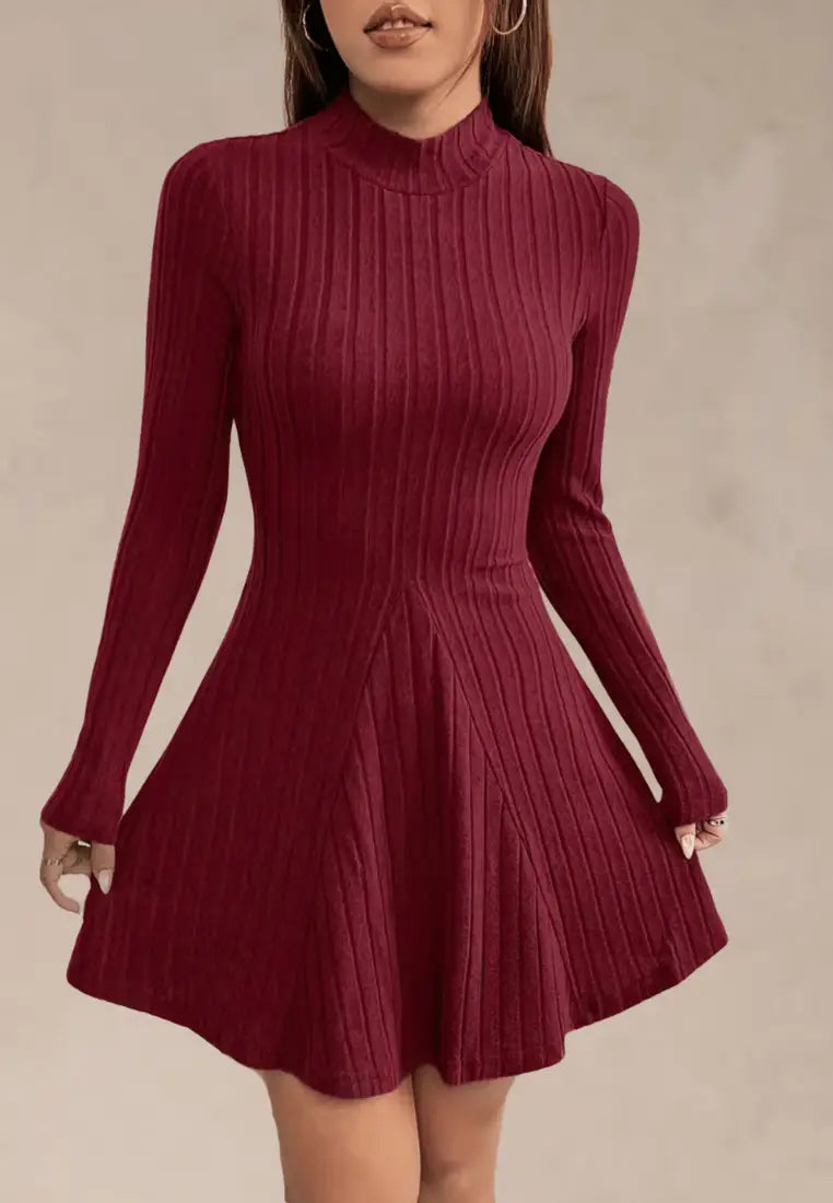 Stylowa dzianinowa sukienka prążkowana z rozkloszowanym dołem w kolorze bordowym to idealne połączenie kobiecości i wygody. Miękka, elastyczna tkanina pięknie dopasowuje się do sylwetki, podkreślając talię i biust. Rozkloszowany dół nadaje lekkości i wdzięku, a długie rękawy oraz subtelny golf dodają elegancji.