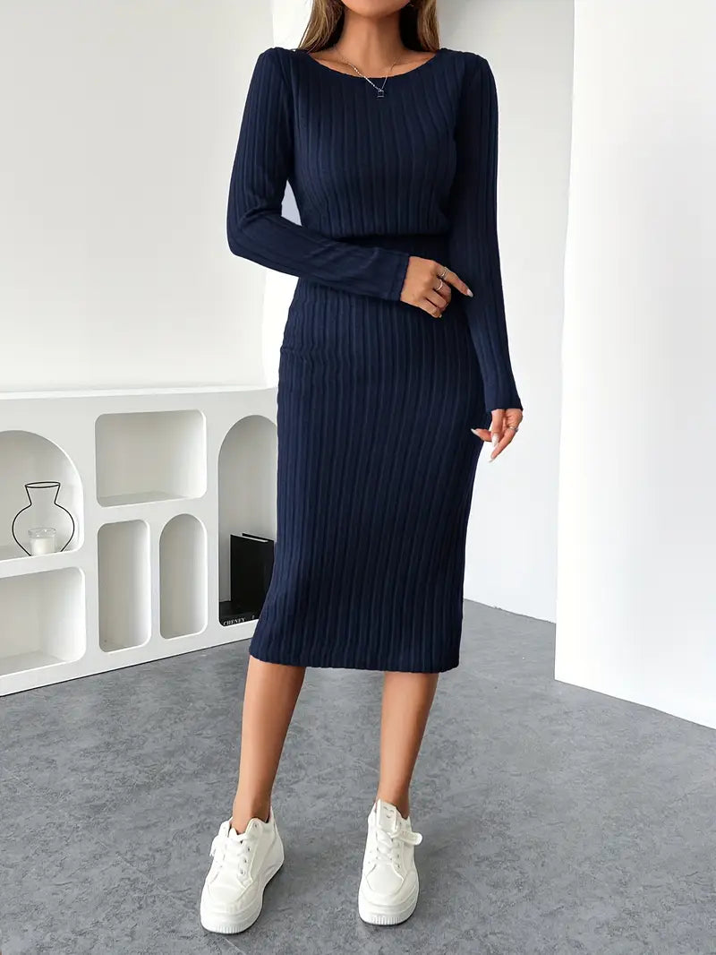 Podkreśl swoją figurę i postaw na ponadczasową elegancję z granatową prążkowaną sukienką midi. Jej dopasowany krój i pionowe prążki optycznie wysmuklają sylwetkę, a długość midi nadaje całości klasy i subtelnego uroku. Wykonana z miękkiego, elastycznego materiału, gwarantuje wygodę i idealne dopasowanie przez cały dzień.