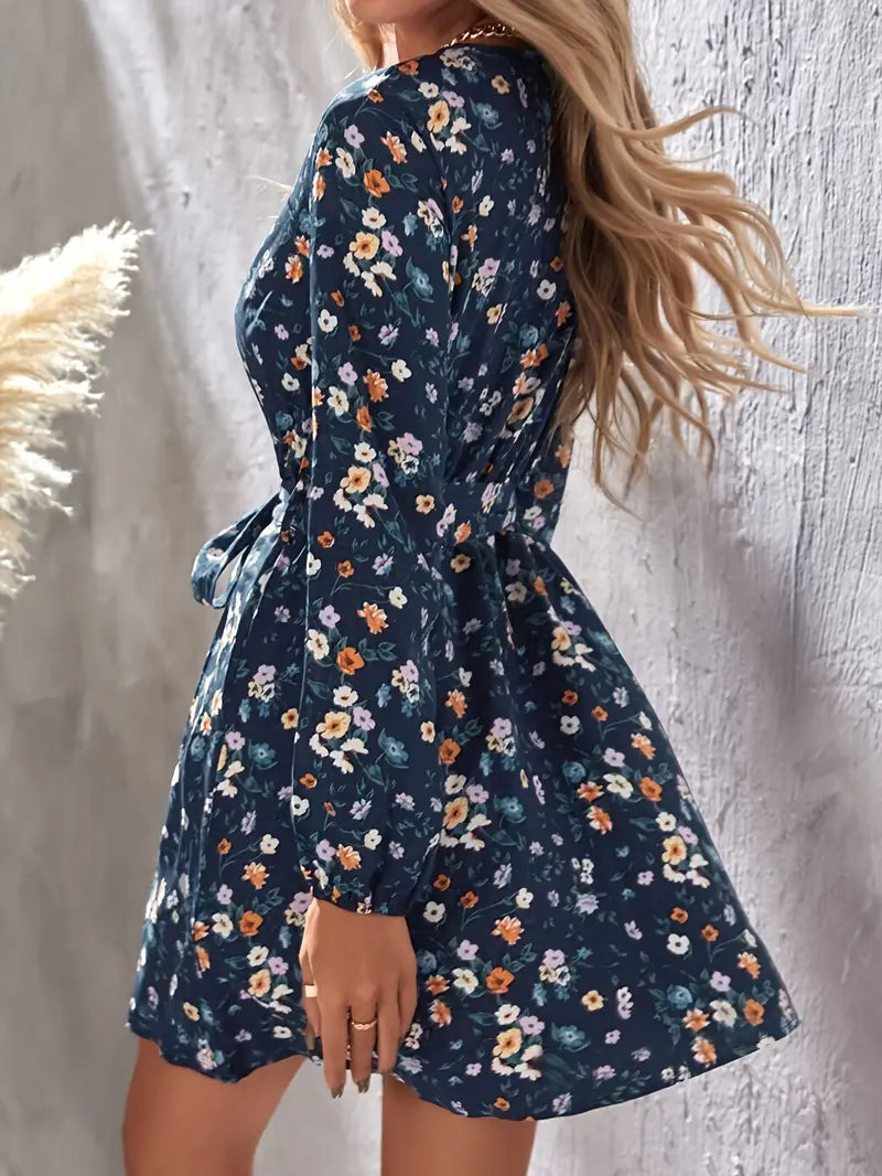 Granatowa sukienka mini w kwiaty z długim rękawem i wiązaniem w talii