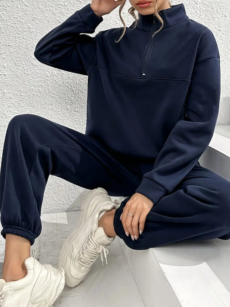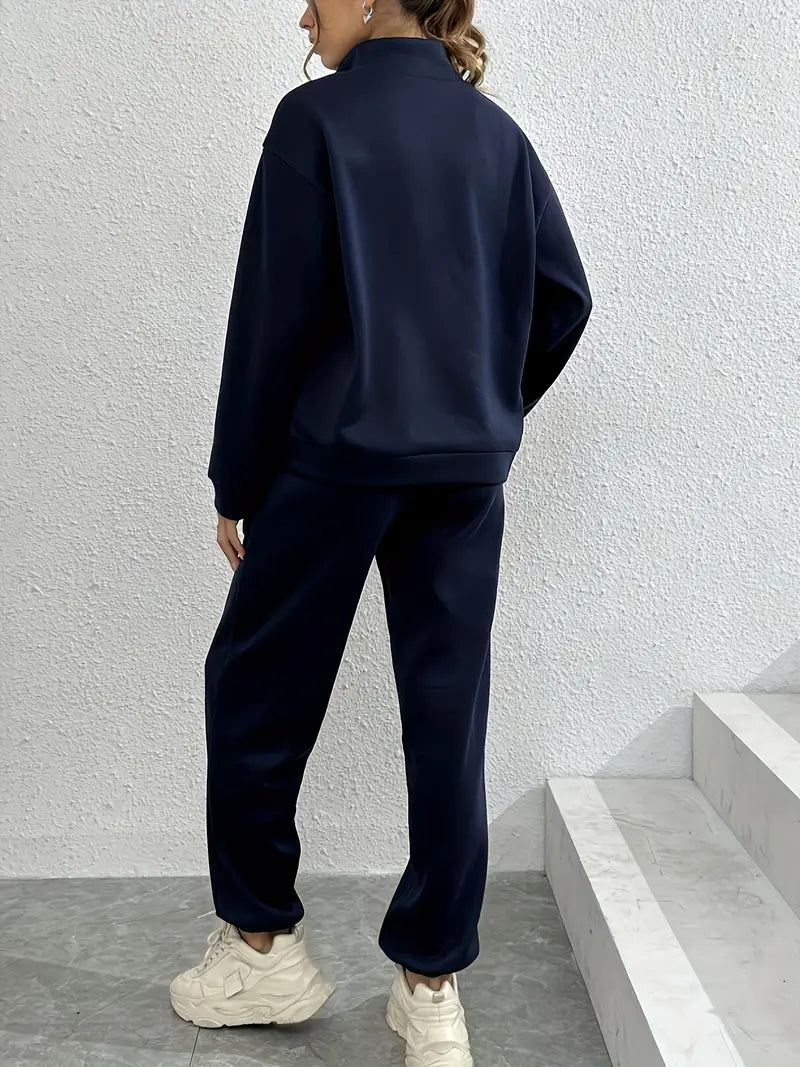 Postaw na nowoczesny i wygodny look z granatowym damskim dresem. Komplet składa się z bluzy z wysokim golfem i praktycznym zamkiem pod szyją oraz spodni o klasycznym kroju z elastyczną gumką w pasie i przy nogawkach. Wykonany z miękkiego materiału, zapewnia komfort noszenia i swobodę ruchu, a jednocześnie prezentuje się stylowo i minimalistycznie. Elegancki odcień granatu sprawia, że to idealny wybór na co dzień.