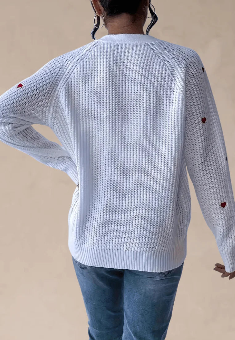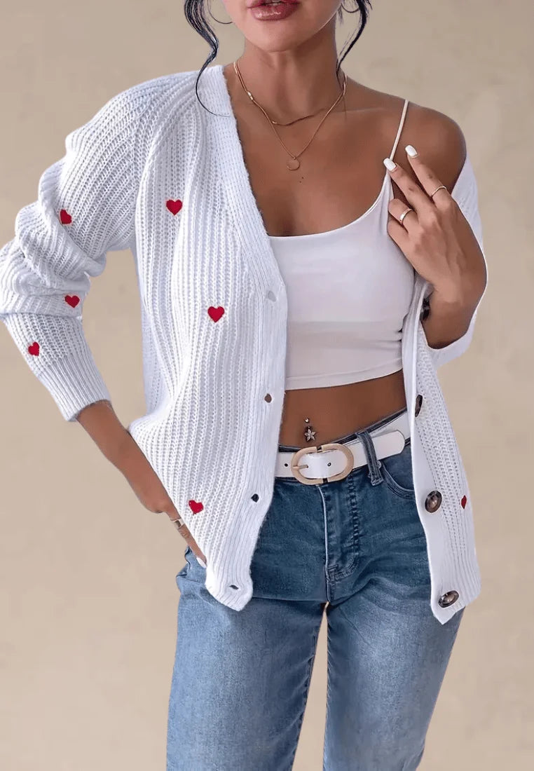 Ten sweter biały zapinany na guziki z czerwonymi serduszkami doskonale komponuje się z jeansami, spódnicami lub legginsami — idealny na co dzień, do pracy czy na spotkania w przytulnym klimacie.