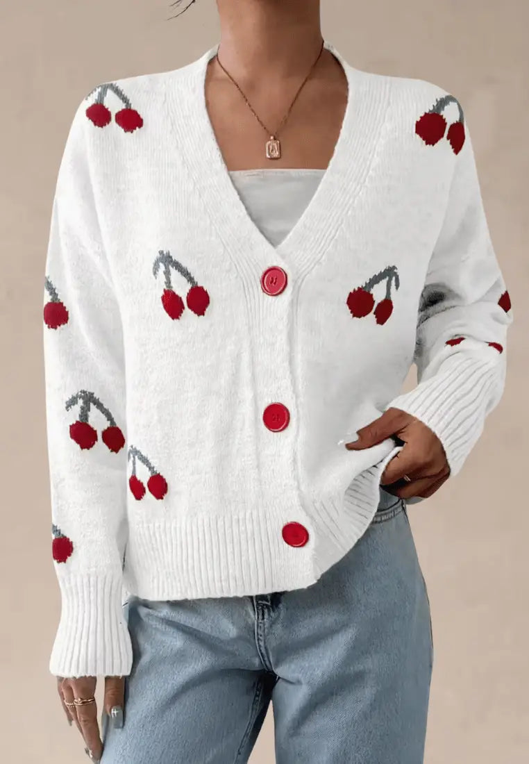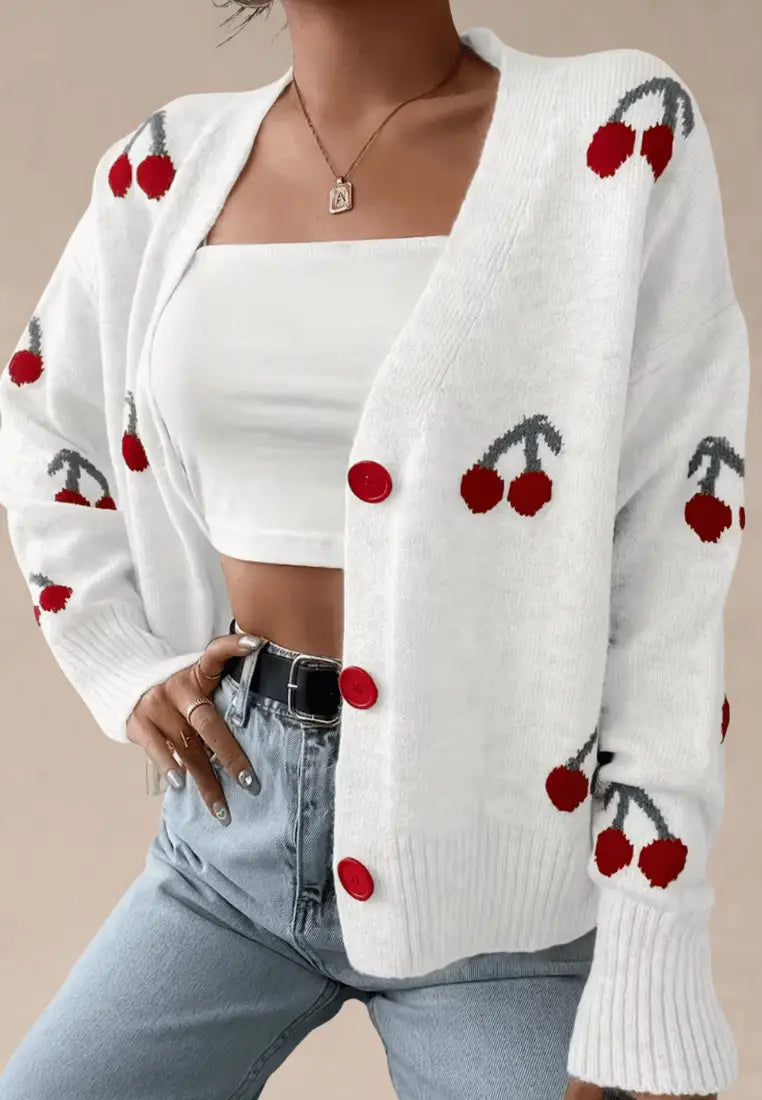 Ten sweter kardigan z wiśniowym motywem w kolorze białym to doskonały wybór na chłodniejsze dni – modny, przytulny i pełen wdzięku.