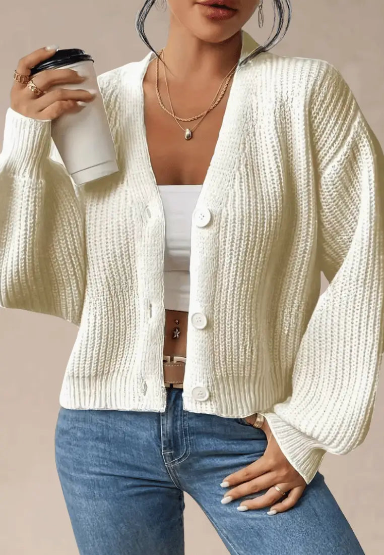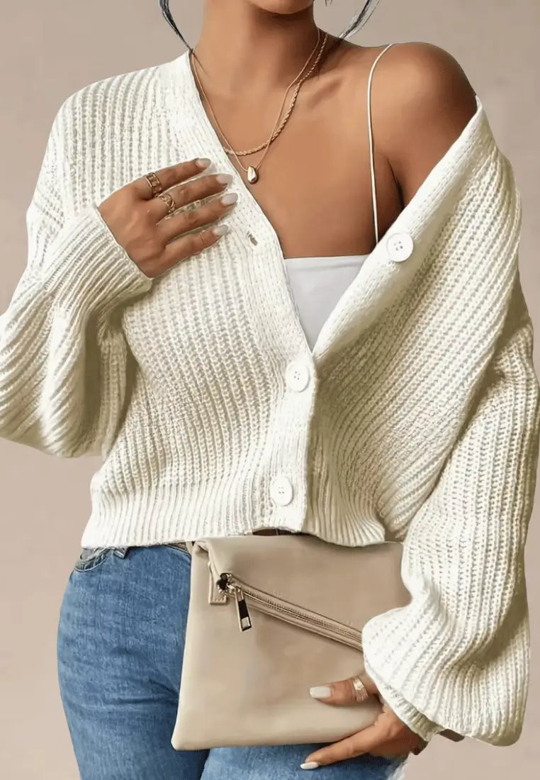 Ten krótki sweter zapinany na guziki o luźnym kroju w kolorze ecru doskonale komponuje się z jeansami, spódnicami lub sukienkami, tworząc modne i przytulne stylizacje na każdą okazję — od codziennych spacerów po wieczorne spotkania.