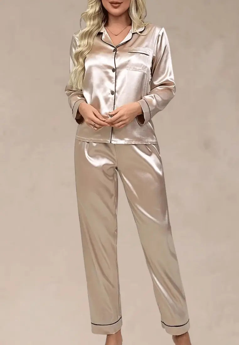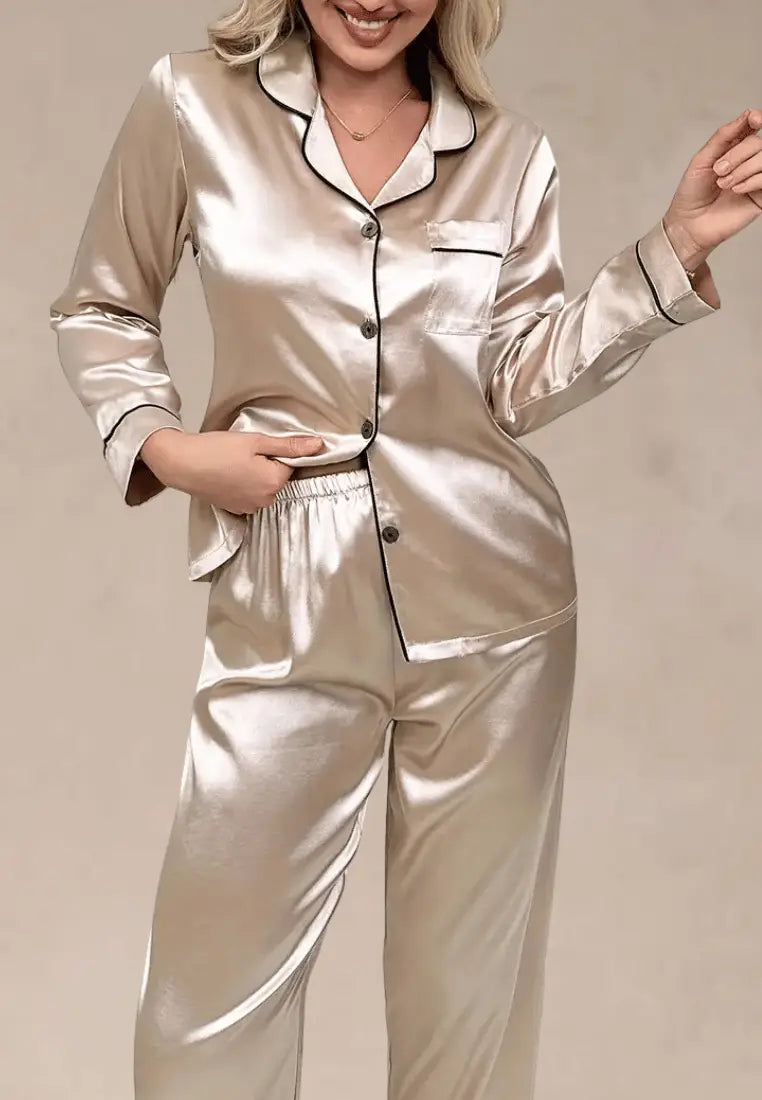 Wprowadź odrobinę luksusu do codziennego relaksu z klasyczną piżamą satynową z kołnierzykiem i kontrastową lamówką w kolorze szampańskim. To ponadczasowy dwuczęściowy komplet, który łączy elegancję z wygodą – idealny na wieczorne odprężenie i stylowy poranek.
