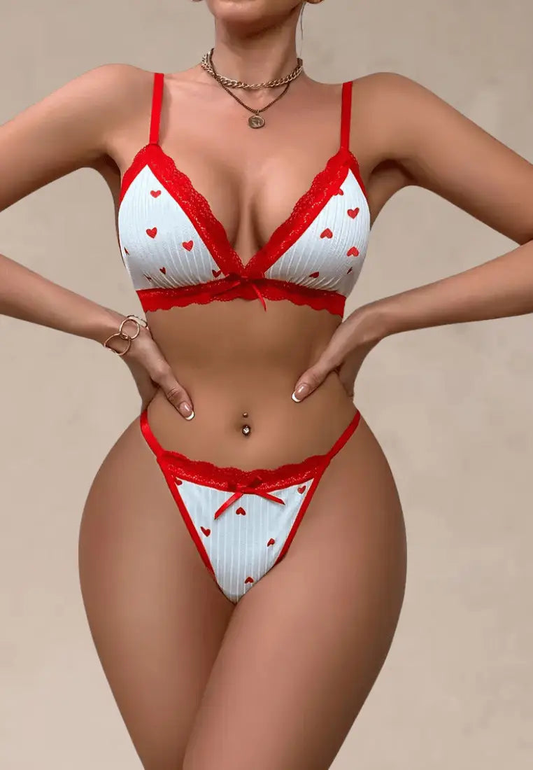 Biały komplet bielizny damski biustonosz i stringi z czerwonymi serduszkami