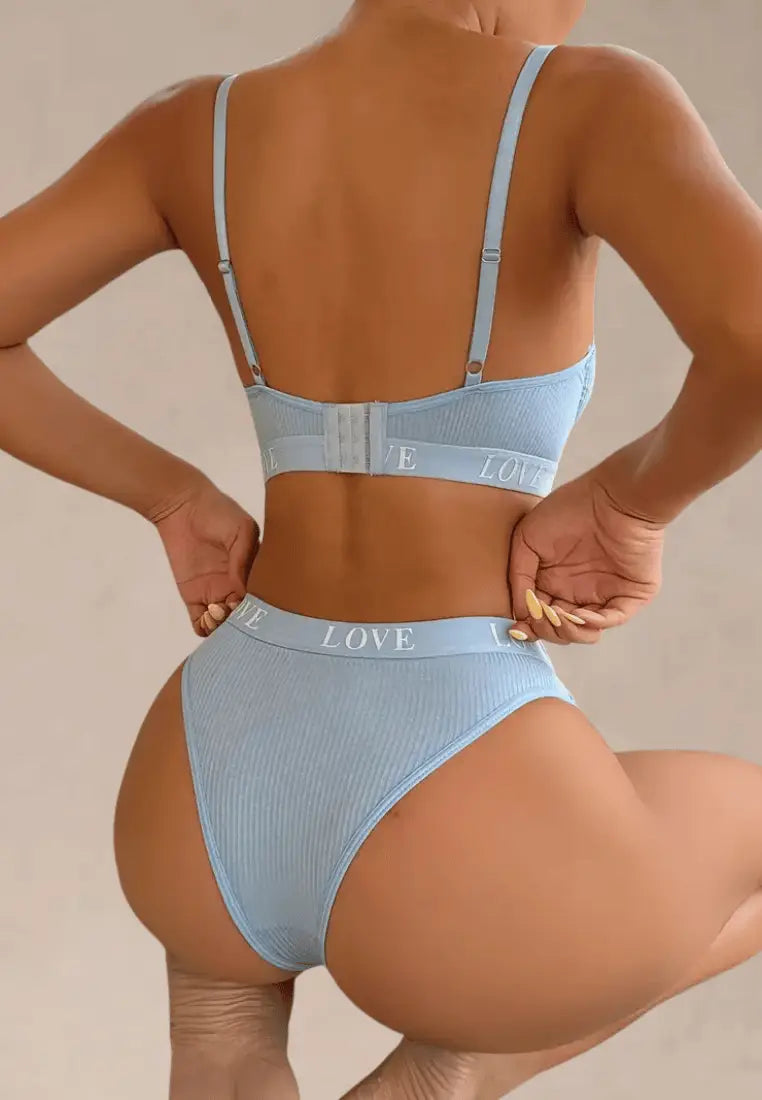 Dodaj swojej codziennej garderobie odrobinę świeżości i uroku z prążkowanym kompletem bielizny w kolorze błękitnym. Wykonany z miękkiej, elastycznej tkaniny, zapewnia idealne dopasowanie i pełen komfort noszenia. Biustonosz z fiszbinami subtelnie podtrzymuje i eksponuje biust, a delikatne ramiączka gwarantują wygodę przez cały dzień. Elastyczna taśma z haftem „LOVE” nadaje całości nowoczesnego, dziewczęcego charakteru.