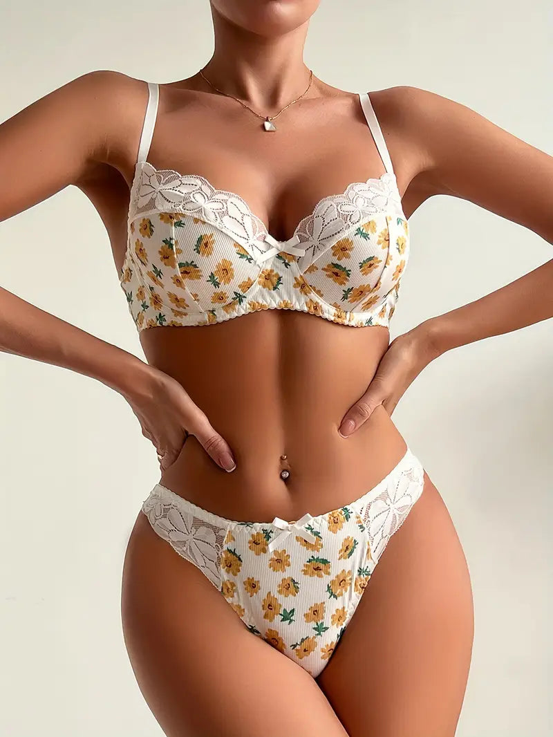 Wykonany z miękkiego, elastycznego materiału komplet idealnie dopasowuje się do ciała, gwarantując komfort przez cały dzień. Kwiatowy wzór w odcieniach bieli i żółci nadaje mu świeżości, a drobna kokardka z przodu subtelnie podkreśla kobiece detale.