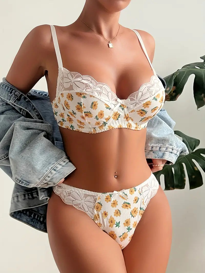 Komplet bielizny w białe i żółte kwiaty z koronkowym wykończeniem