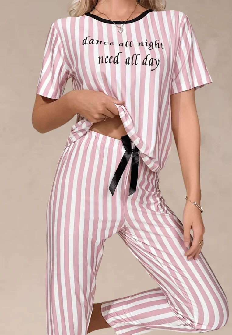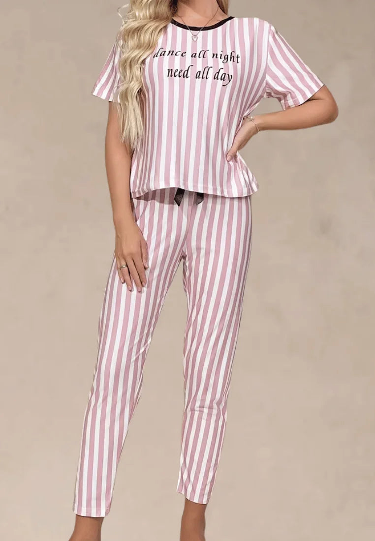 Różowy komplet piżamowy damski w paski z krótkim rękawem i długimi spodniami