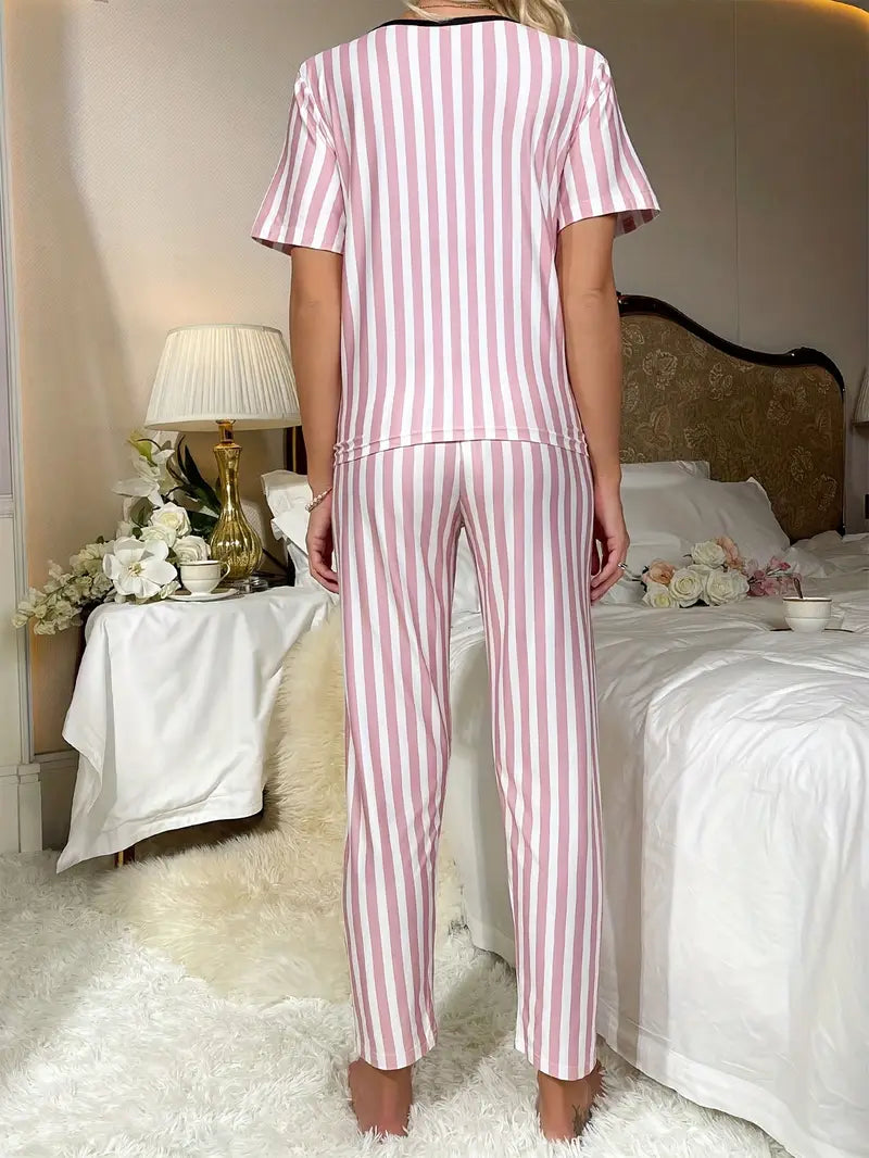 Wzór w pionowe paski optycznie wysmukla sylwetkę, a kontrastowy napis i czarne wykończenie dekoltu dodają piżamce modowego charakteru. Miękki materiał jest przyjemny dla skóry i zapewnia komfort przez całą noc.