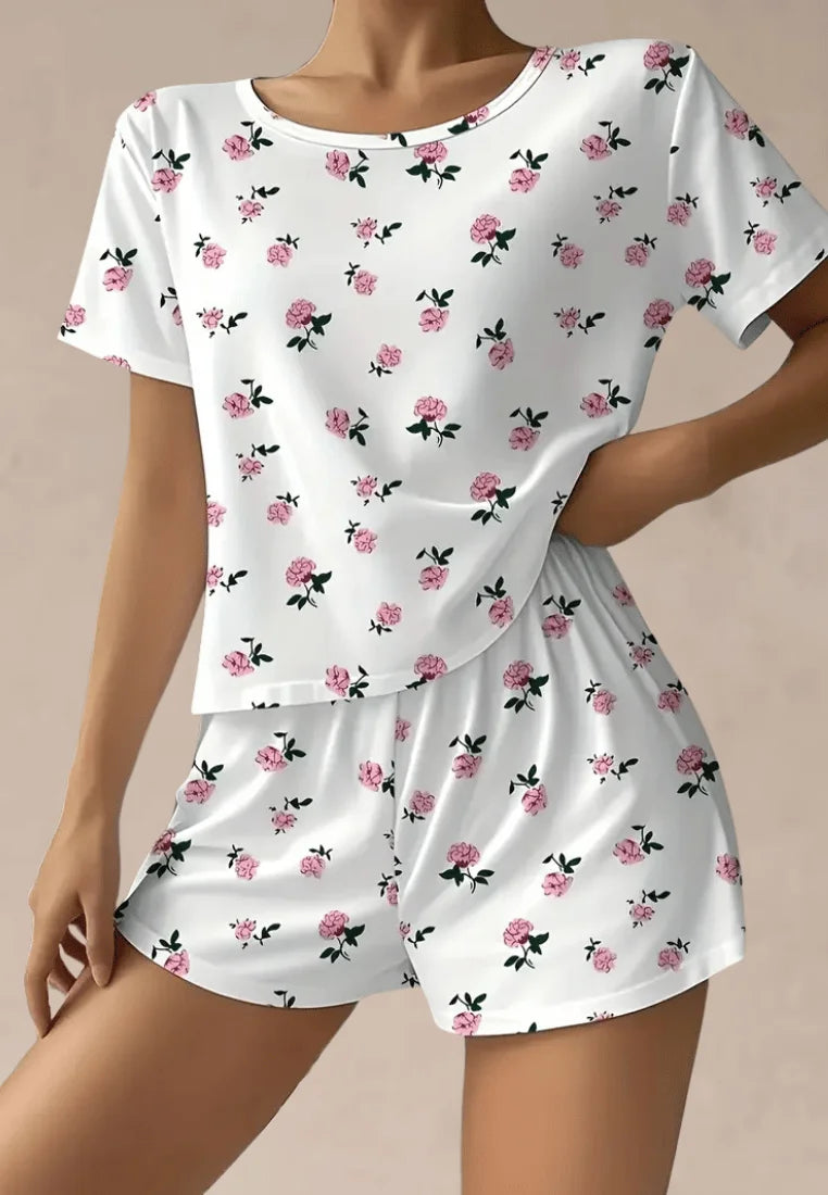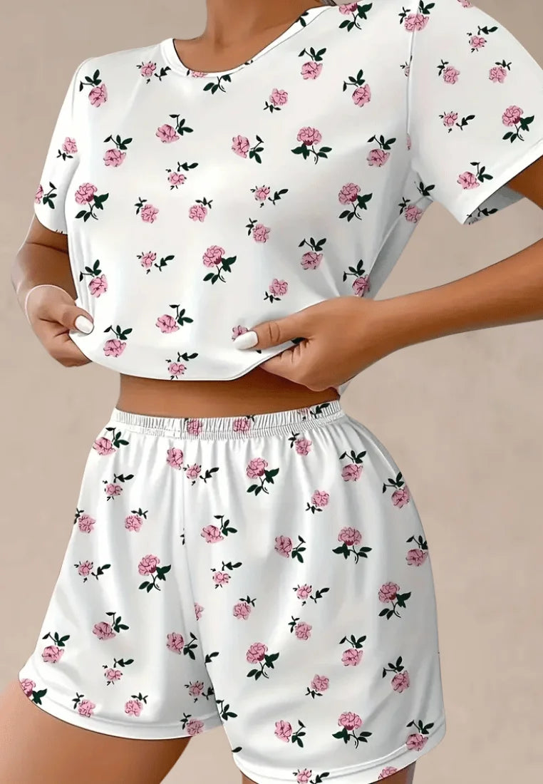 Bluzka z okrągłym dekoltem i krótkimi rękawkami idealnie komponuje się z luźnymi szortami o elastycznej talii, tworząc harmonijny i dziewczęcy komplet. Białe tło ozdobione subtelnym kwiatowym nadrukiem w odcieniach różu sprawia, że całość prezentuje się świeżo, lekko i kobieco.
