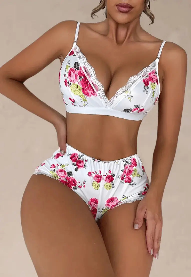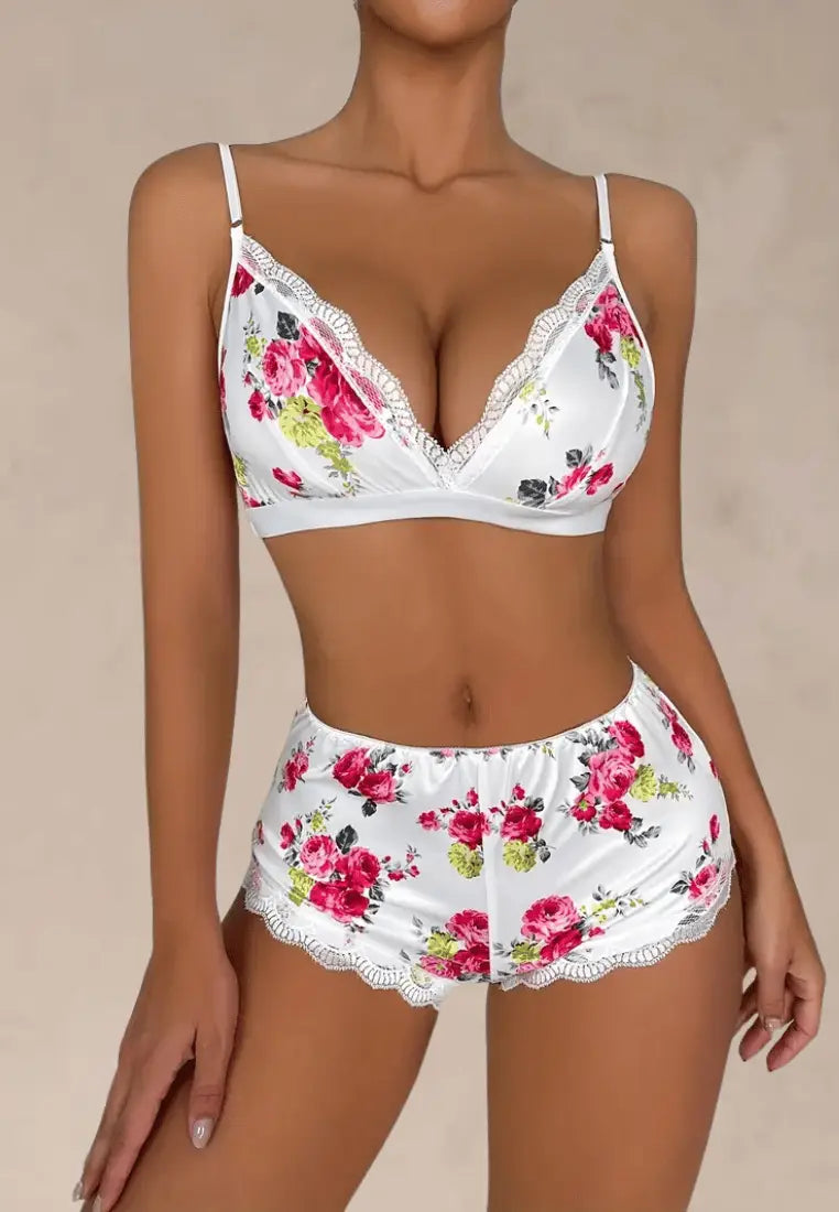 Biustonosz z miękkimi, trójkątnymi miseczkami i regulowanymi ramiączkami podkreśla naturalny kształt biustu, a krótkie satynowe spodenki z koronkowym wykończeniem dodają całości dziewczęcego uroku. To idealny wybór na letnie noce lub leniwe poranki.