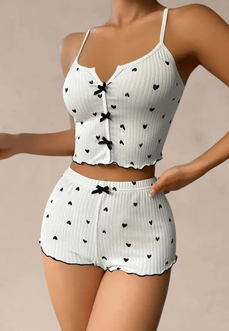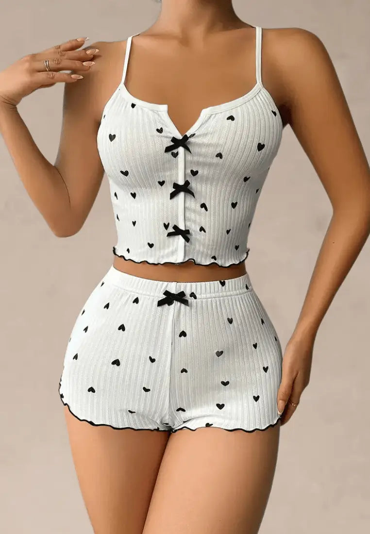 Romantyczny, zmysłowy i wygodny – komplet piżamowy w czarne serduszka z krzyżowanymi ramiączkami i kokardkami w kolorze ecru to doskonały wybór na letnie noce oraz poranki w domowym zaciszu. Zestaw składa się z miękkiego topu na cienkich ramiączkach i dopasowanych szortów z elastyczną talią – razem tworzą harmonijną, lekką i kobiecą całość.