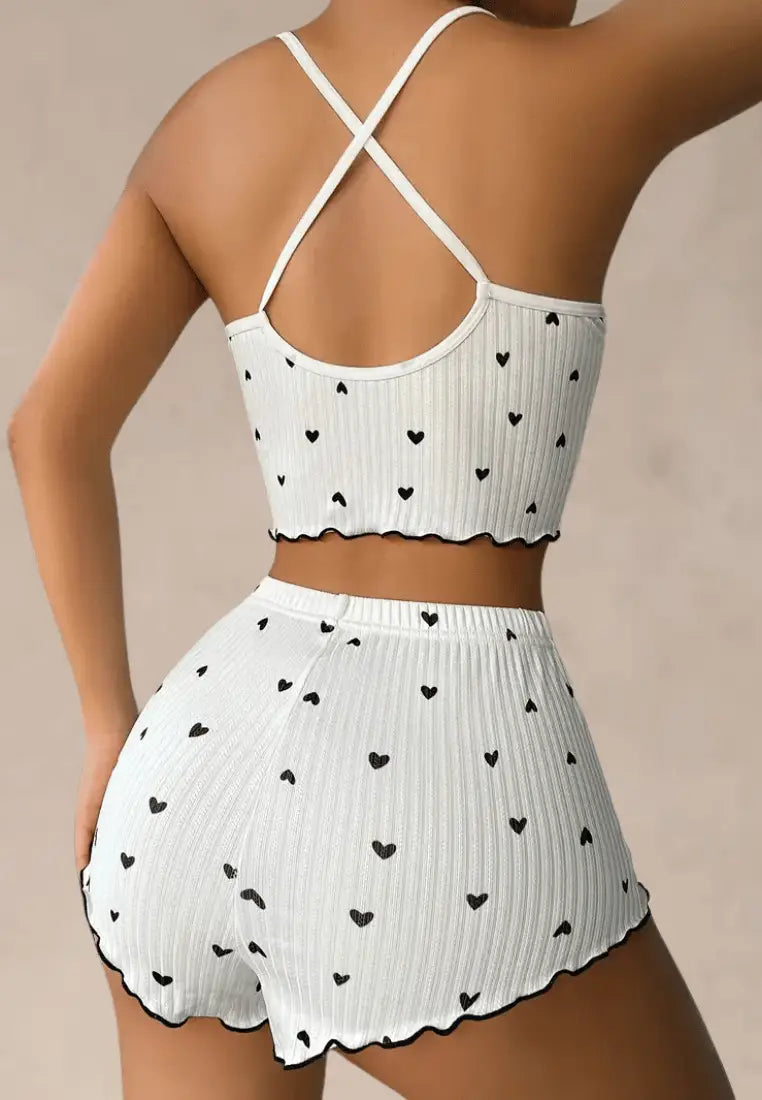 Biały komplet piżamowy damski z topem i szortami w serduszka