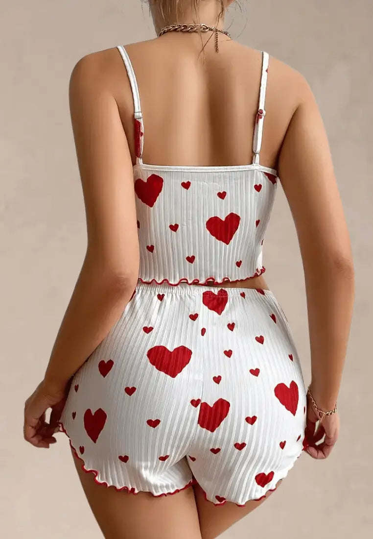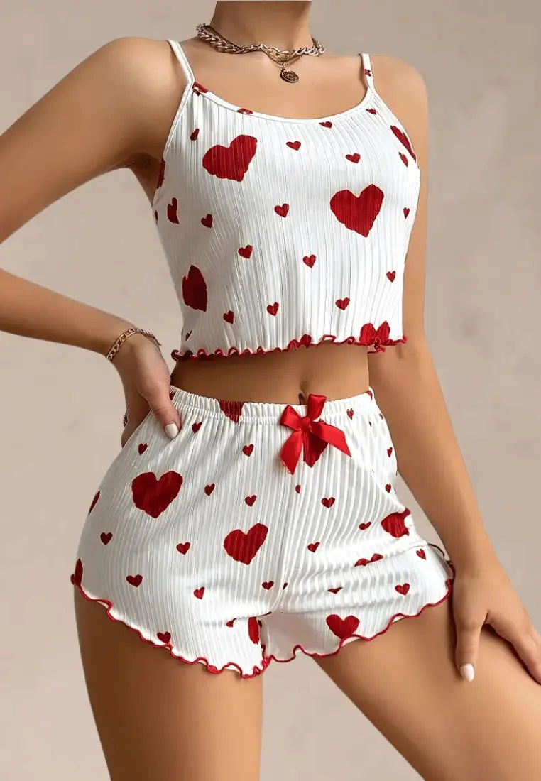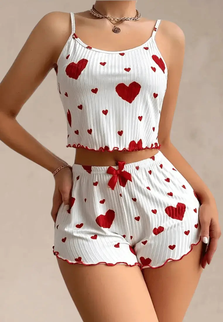 Wprowadź do swojej nocnej garderoby odrobinę miłosnego klimatu z kompletem piżamowym w czerwone serduszka z topem na ramiączkach i szortami. Ten zestaw to połączenie dziewczęcego uroku i wygody, które sprawia, że każda noc staje się nieco bardziej wyjątkowa.