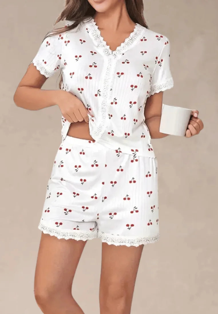 Biały komplet piżamowy damski z krótkim rękawem i spodenkami w wiśnie