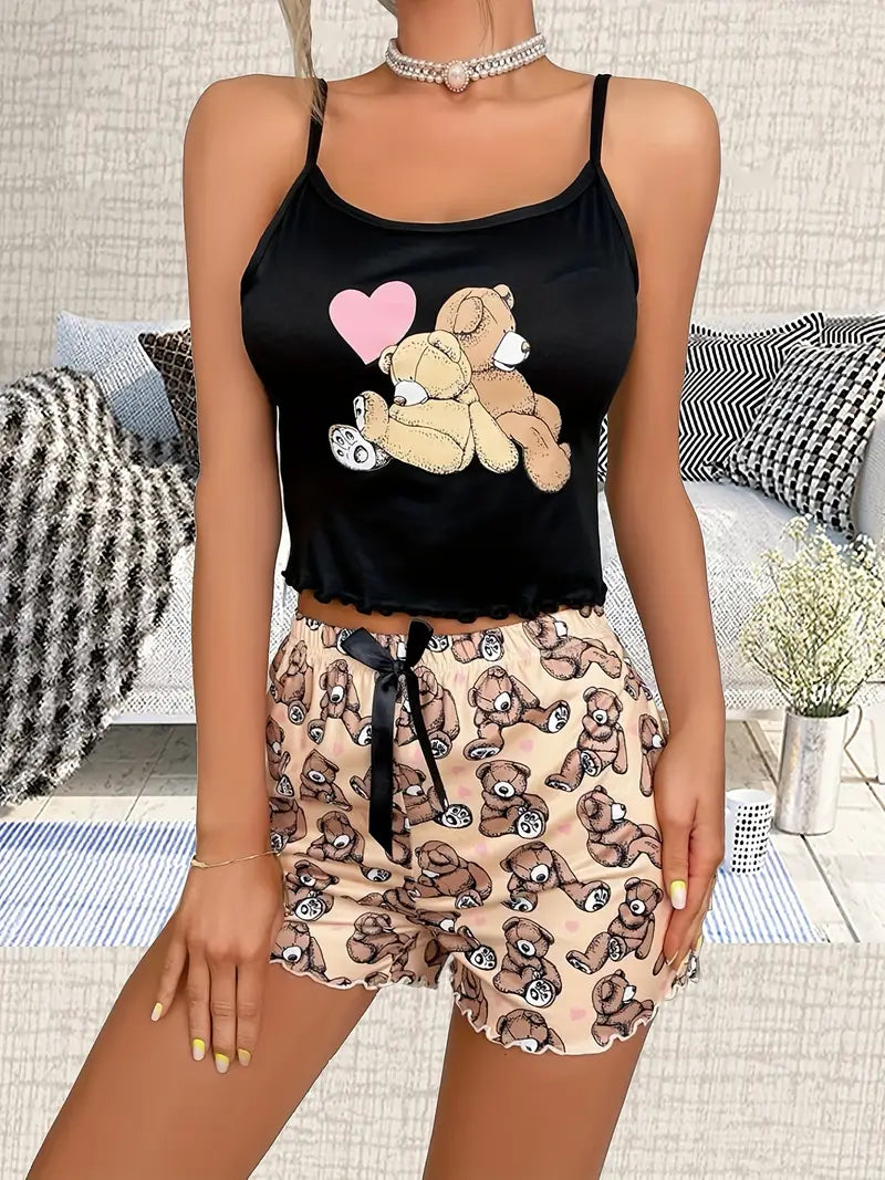 Komplet piżamowy z czarnym topem i beżowymi szortami w misie pluszowe