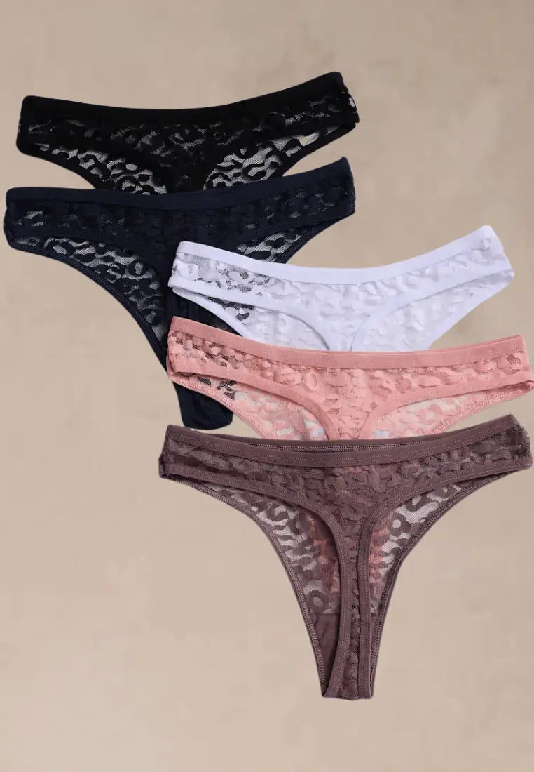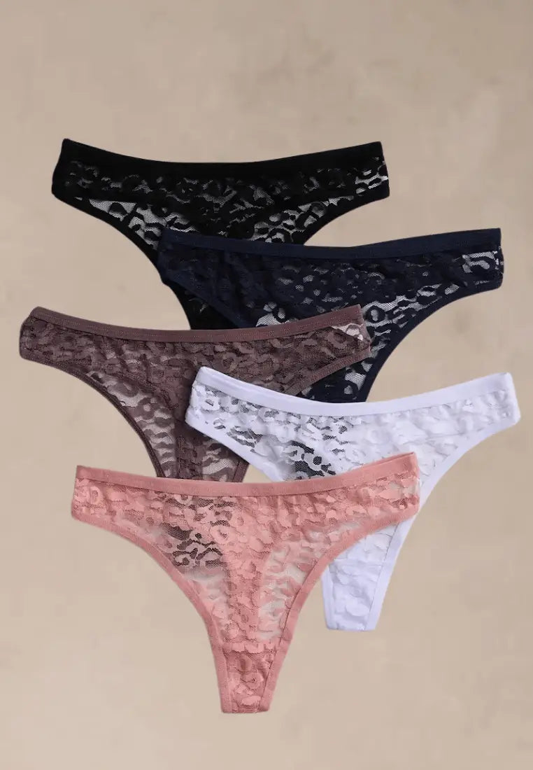 Dodaj swojej bieliźnianej kolekcji odrobinę zmysłowości z zestawem pięciu koronkowych stringów o wyjątkowym, panterkowym wzorze. Wykonane z delikatnej, elastycznej koronki, idealnie dopasowują się do ciała, zapewniając komfort noszenia i subtelne podkreślenie kobiecych kształtów.