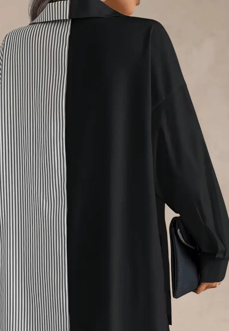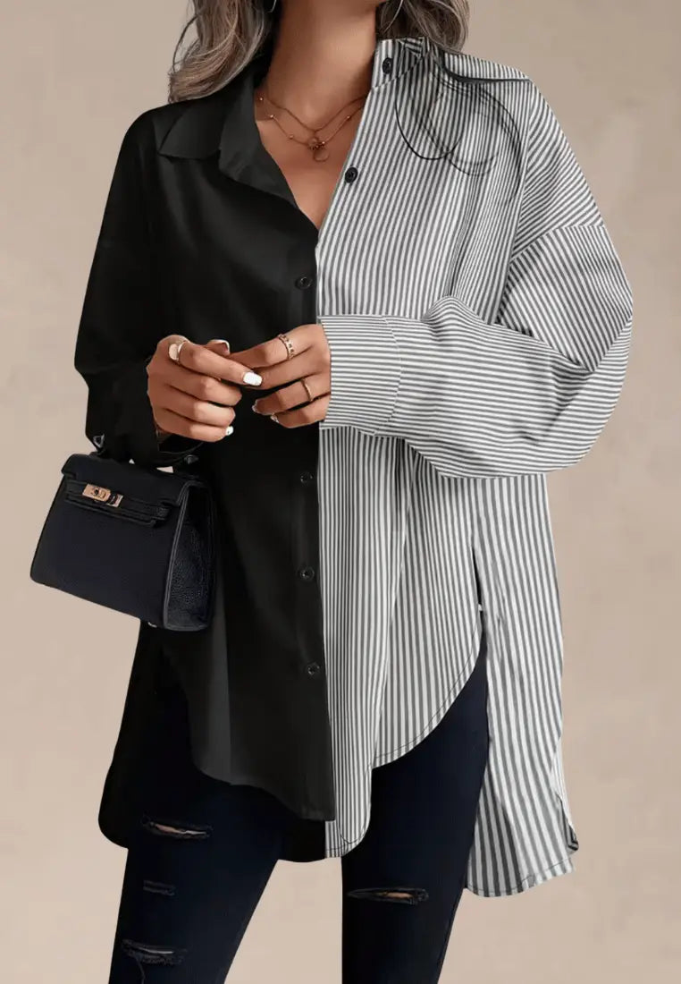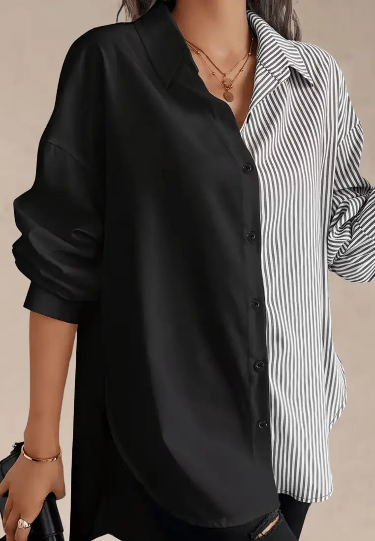 Stylowa koszula dwukolorowa czarno-biała oversize to propozycja dla kobiet, które lubią modę z charakterem. Wyróżnia się unikalnym połączeniem gładkiej czerni i klasycznych białych pasków, tworząc nowoczesny kontrast. Luźny fason i lekko przedłużony krój zapewniają wygodę oraz swobodę ruchów, idealnie wpisując się w miejskie, nonszalanckie stylizacje.