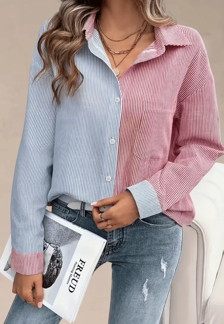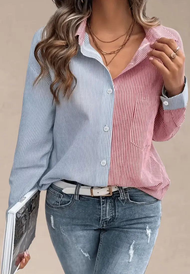 Dwukolorowa koszula damska w paski z kieszenią i jasnymi guzikami