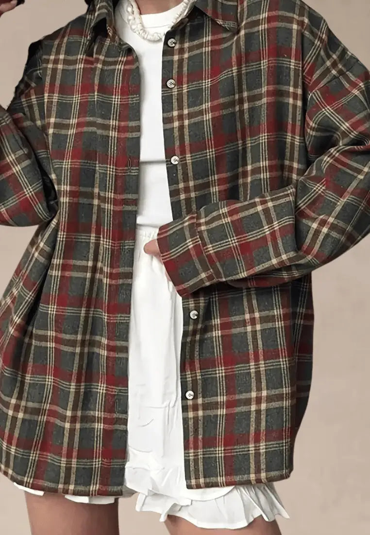 Ta koszula flanelowa oversize w zielono-czerwoną kratę sprawdzi się zarówno jako klasyczna koszula, jak i narzutka na top lub golf. Idealna do jeansów, legginsów czy sukienek – doskonała propozycja na jesień i zimę.