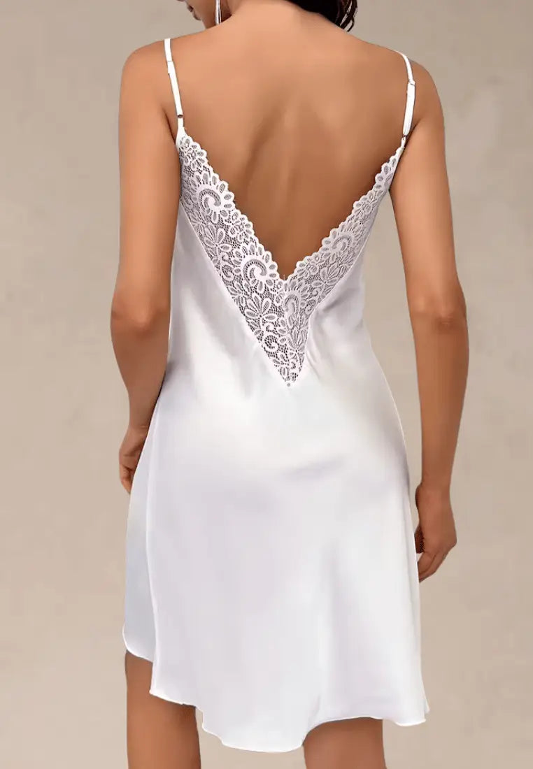 Zmysłowa satynowa koszulka nocna biała z koronkowym dekoltem na plecach to połączenie elegancji i subtelnego uroku. Wykonana z delikatnej, błyszczącej satyny, miękko otula ciało, podkreślając kobiece kształty i zapewniając wyjątkowy komfort snu. Plecy zdobi głęboki, trójkątny dekolt obszyty koronką o kwiatowym wzorze, który dodaje całości romantycznego charakteru.