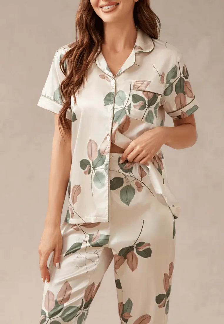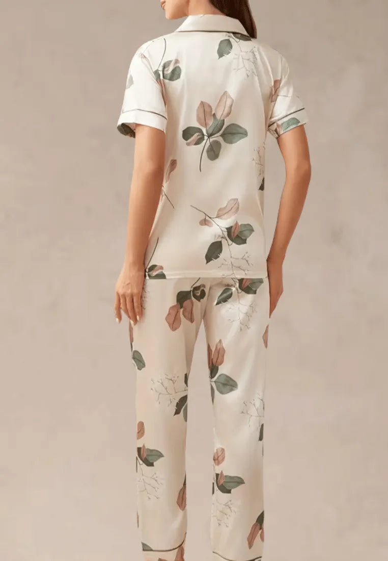 Kremowy komplet piżamowy damski z krótkim rękawem i długimi spodniami w liście