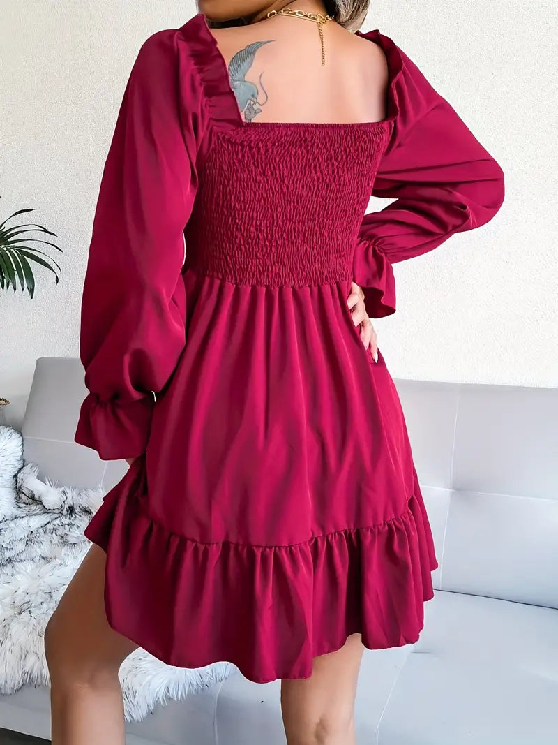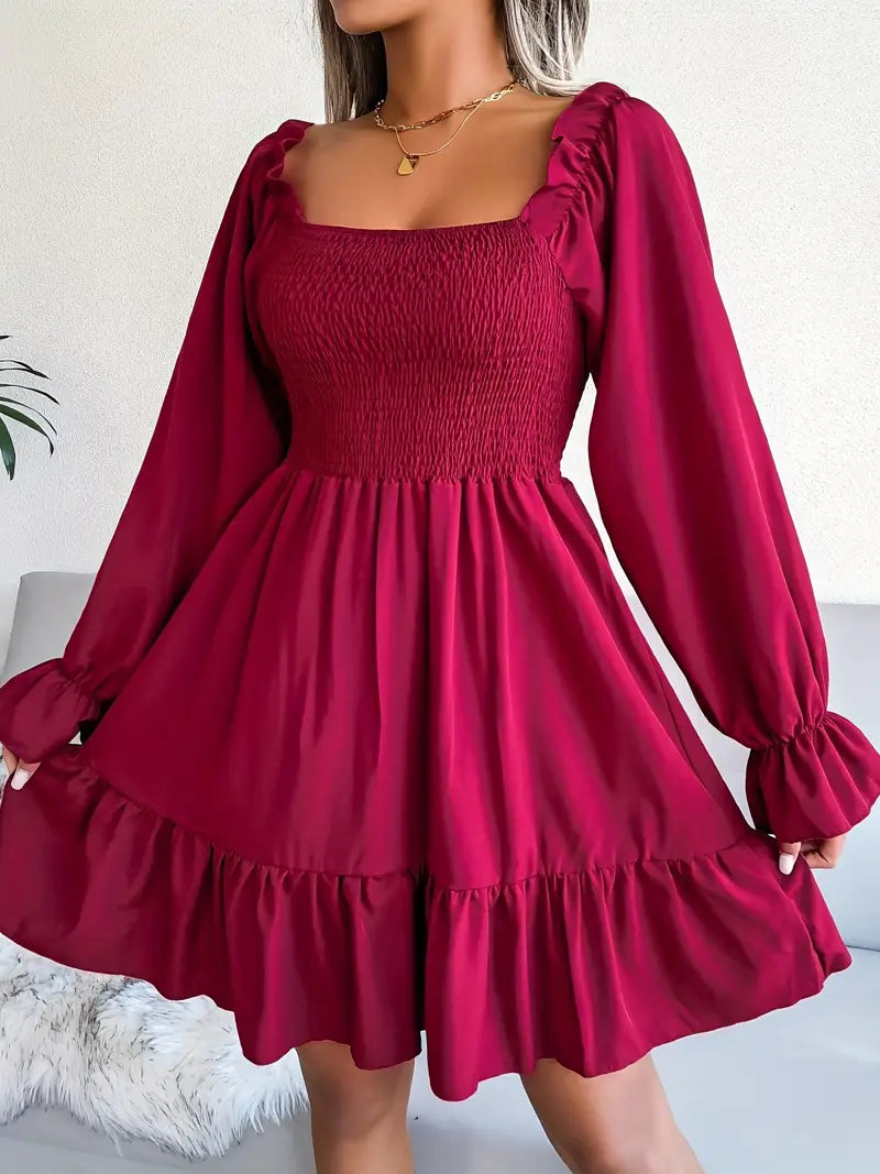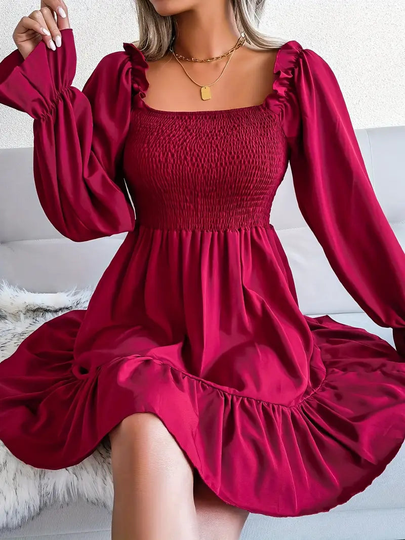 Długie, bufiaste rękawy zakończone subtelnym ściągaczem dodają kreacji elegancji, a kwadratowy dekolt podkreśla linię ramion i szyi. To model, który świetnie sprawdzi się zarówno na randkę, spotkanie z przyjaciółmi, jak i wyjątkowe okazje.