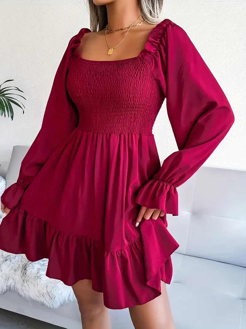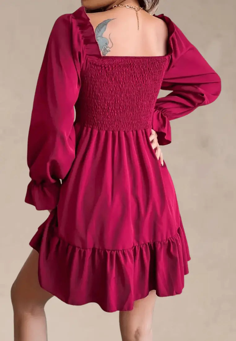Ta krótka bordowa sukienka to idealne połączenie romantyzmu i kobiecej lekkości. Wykonana z delikatnej, miękko układającej się tkaniny, zachwyca marszczonym gorsetem, który pięknie dopasowuje się do sylwetki, oraz falbaną u dołu, nadającą całości dziewczęcego uroku.