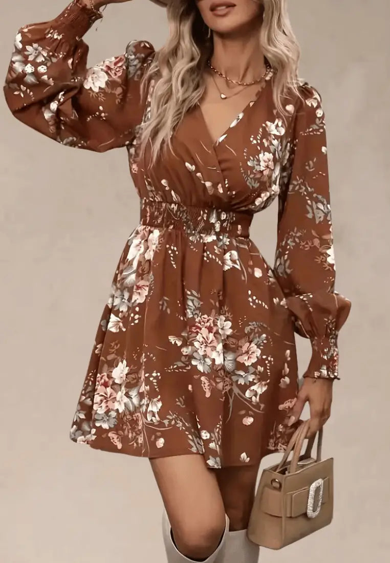 Brązowa sukienka w kwiaty z kopertowym dekoltem