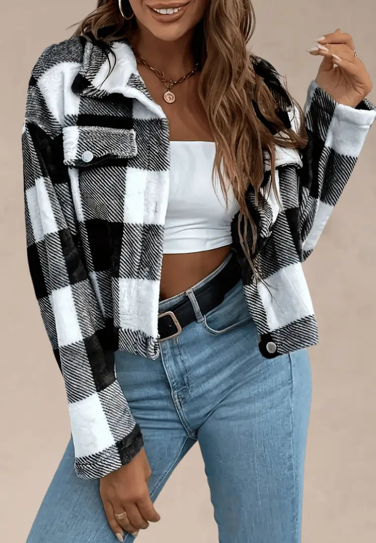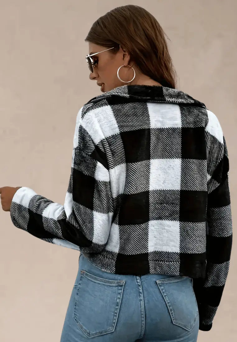 Postaw na wygodę i modny wygląd z krótką kurtką polarową w czarno-białą kratę. Ten stylowy model łączy w sobie ciepło, miękkość i casualowy charakter, dzięki czemu doskonale sprawdzi się w codziennych stylizacjach. Wykonana z miękkiego polaru, zapewnia komfort noszenia nawet w chłodniejsze dni, a klasyczny kołnierz dodaje jej ponadczasowego uroku.
