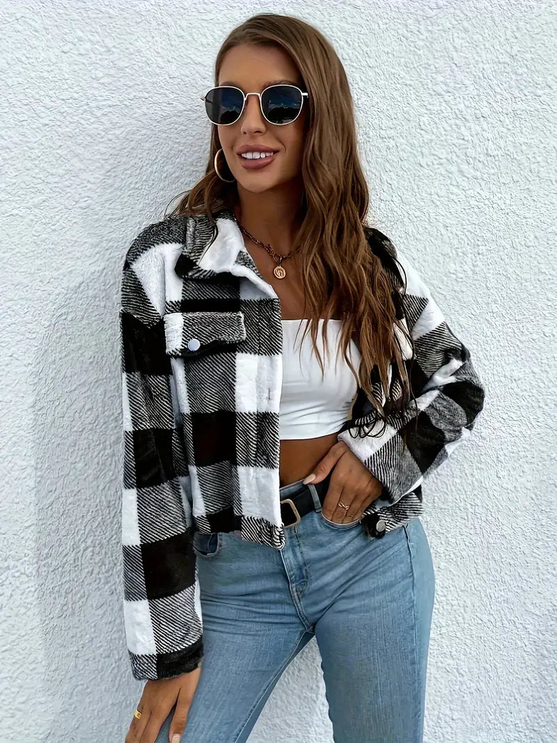 Krótka kurtka polarowa w czarno-białą kratę z kołnierzem