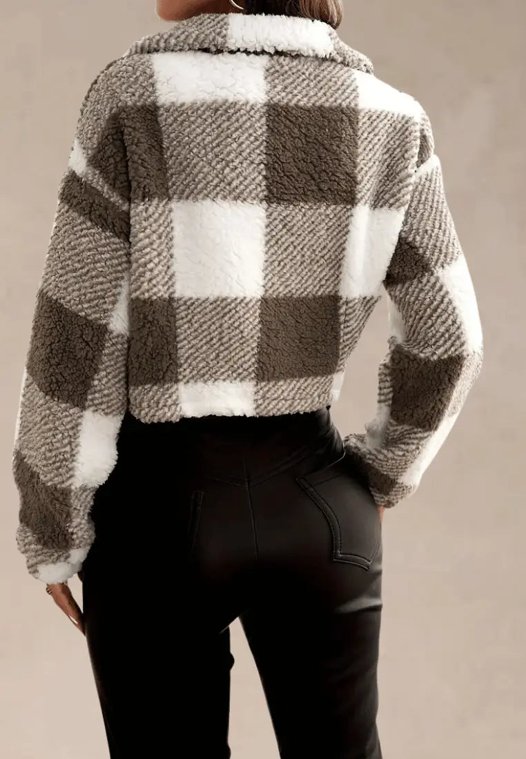 Beżowa kurtka damska polarowa krótka w kratę na zamek