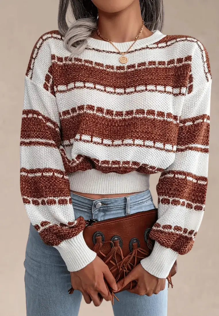 Biały sweter damski w brązowe paski z okrągłym dekoltem