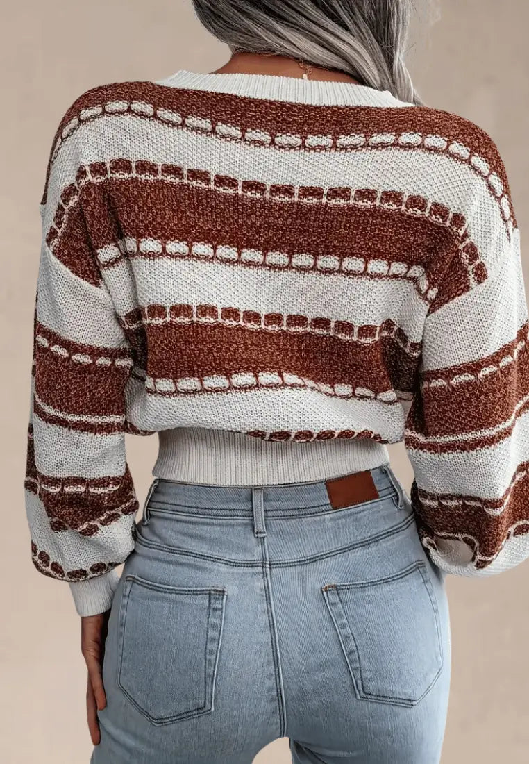 Długość sięgająca talii podkreśla sylwetkę i świetnie komponuje się z jeansami, spódnicami czy spodniami z wysokim stanem. Szerokie, długie rękawy dodają całości nonszalancji, a połączenie bieli z ciepłym odcieniem brązu i kontrastującym wzorem w pasy nadaje stylizacji przytulnego, jesienno-zimowego charakteru.
