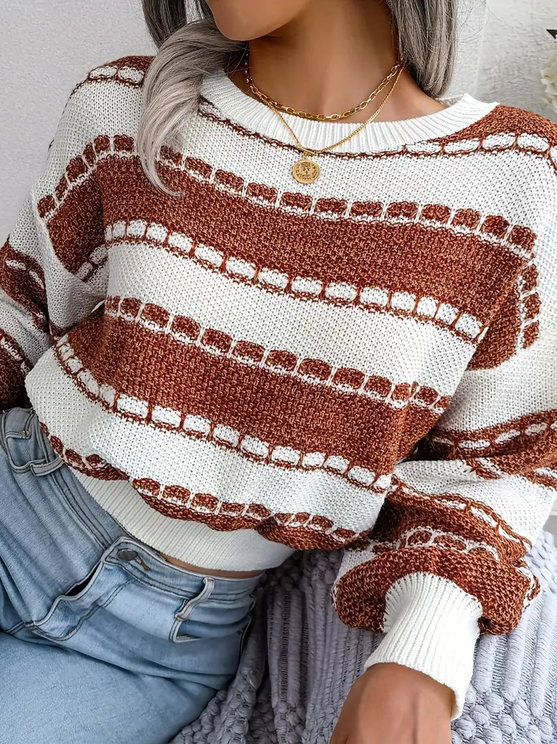 Krótki biało-brązowy sweter w pasy z luźnymi rękawami