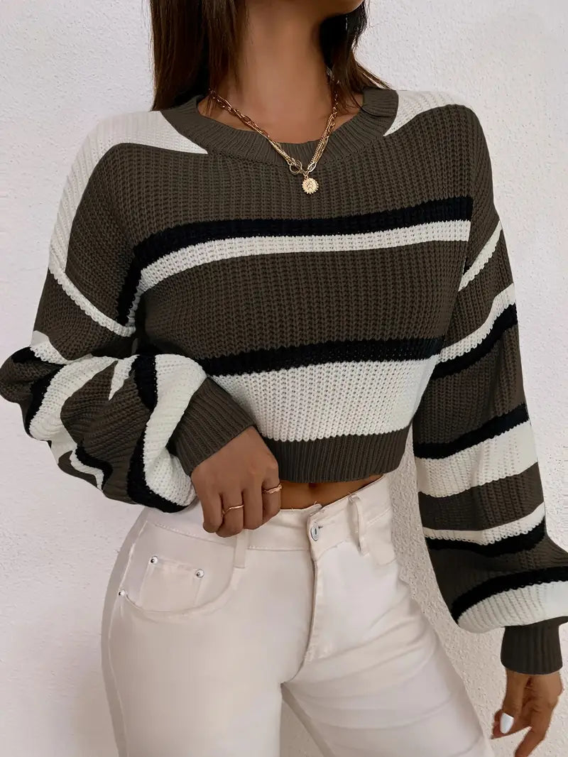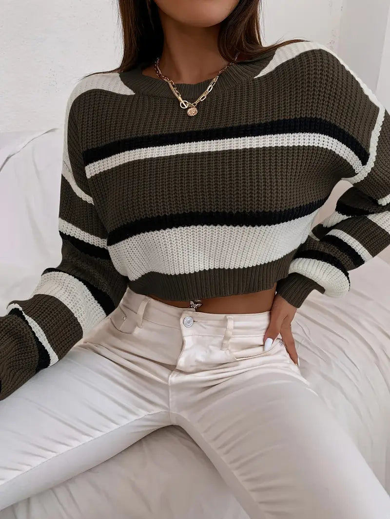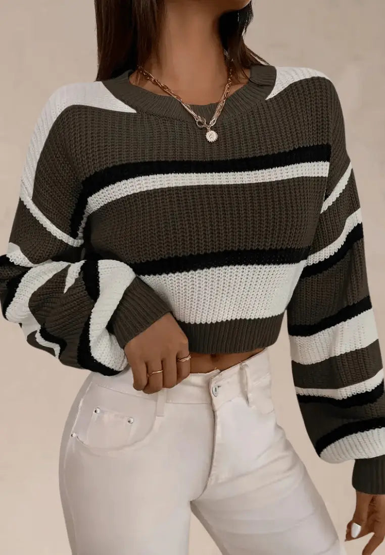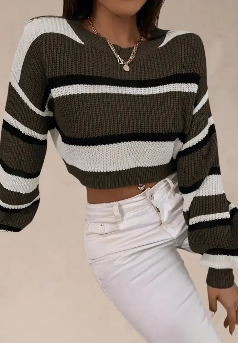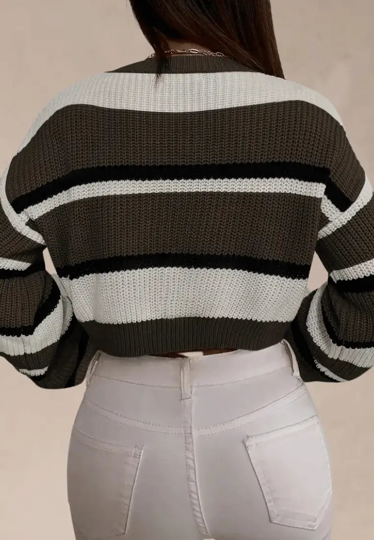 Odkryj swobodny urok i wygodę w jednym dzięki krótkiemu swetrowi w oliwkowo-białe pasy z czarnymi akcentami. Wykonany z miękkiej, przyjemnej w dotyku dzianiny o wyrazistej fakturze, zapewnia ciepło i komfort w chłodniejsze dni, jednocześnie podkreślając modny, codzienny styl.