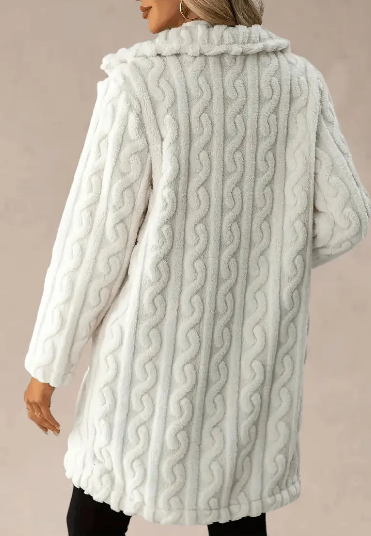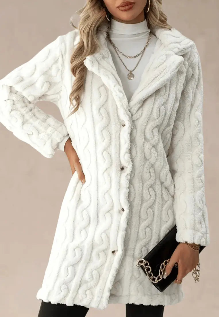 Ta długa mleczna kurtka z miękkiego futerka o eleganckim kroju doskonale prezentuje się zarówno z dopasowanymi spodniami, jak i elegancką sukienką. Idealna na chłodne dni, łączy w sobie luksus, wygodę i ponadczasową elegancję.