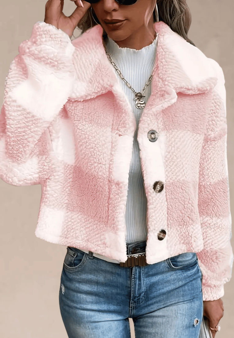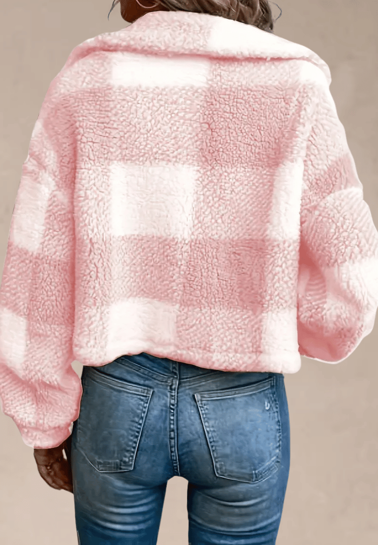 Różowa kurtka damska polarowa krótka w kratę z guzikami