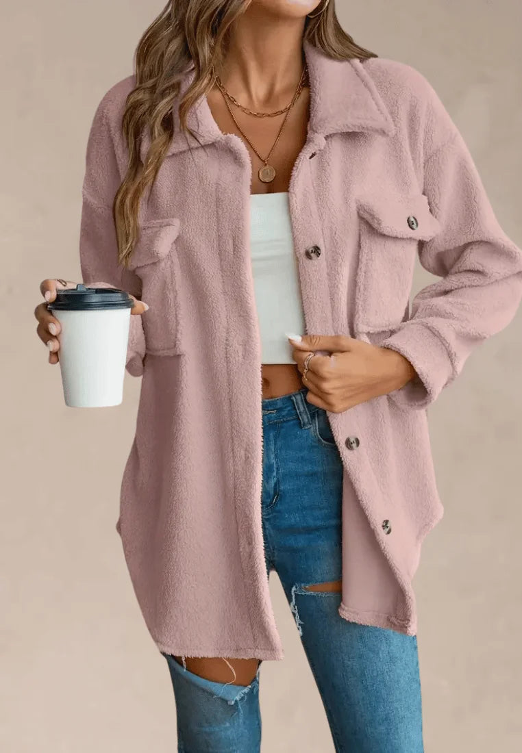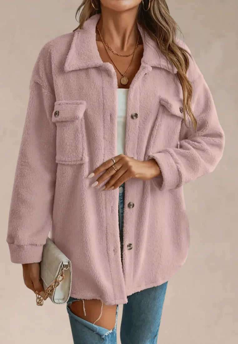 Duże kieszenie z przodu i guziki w kontrastowym odcieniu dodają całości lekkości i miejskiego stylu. Kurtka koszulowa różowa z miękkiego futerka zapinana na guziki świetnie sprawdzi się w codziennych stylizacjach z jeansami, legginsami czy botkami. To idealny wybór dla kobiet ceniących modę i wygodę w jednym.